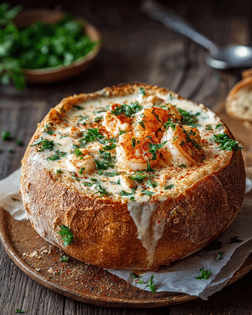 A creamy, savory mix of shrimp, crab, and scallops in a garlicky cheese sauce, served piping hot in a toasted sourdough bread bowl. Perfect for cozy dinners and special gatherings.